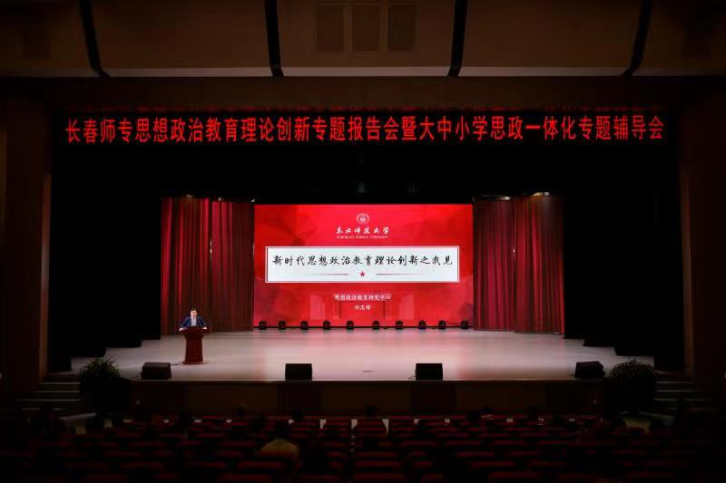为贯彻习近平总书记在学校思想政治理论课教师座谈会上的重要讲话精神,落实吉林省大中小学思政一体化工作部署,推进思想政治教育工作改革创新,辐射带动合隆区域学校思想政治工作整体提升,5月26日下午,我校在艺术中心举办思想政治教育理论创新专题报告会暨大中小学思政一体化专题辅导会。东北师范大学思想政治教育研究中心副教授、博士生导师任志锋以《新时代思想政治教育理论创新之我见》为题做了专题报告。