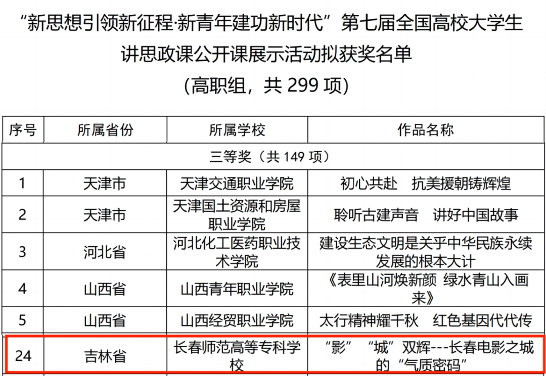 近日,教育部高校思政课教学指导委员会公示了第七届全国高校大学生讲思政课公开课展示活动获奖作品结果,由我校马克思主义学院(思政部)朱春艳、邹劲、温薪田老师指导,学生张绮、崔欣妍、何嘉鹏、刘俊、侯镇宇共同完成的作品《“影”“城”双辉—长春电影之城的气质密码》荣获高职组三等奖,取得了我校参加大学生讲思政课大赛历史上最好成绩,实现了本项比赛国家级奖项上零的突破。